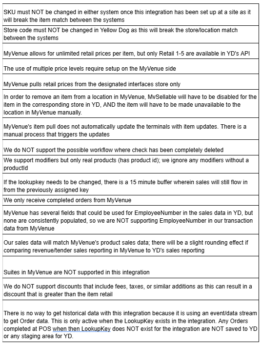 Yellow Dog Item to POS Mapping - Our MyVenue integration matches items on SKU: MyVenue ProductCode to YD SKU